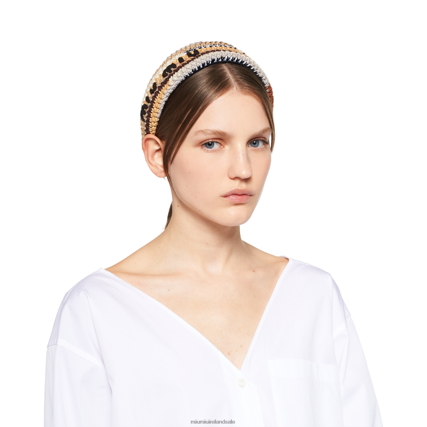 A vibrant color-block pattern animates this crochet headband. Retro references and sophisticated workmanship distinguish this accessory embellished with the iconic embroidered Miu Miu logo.