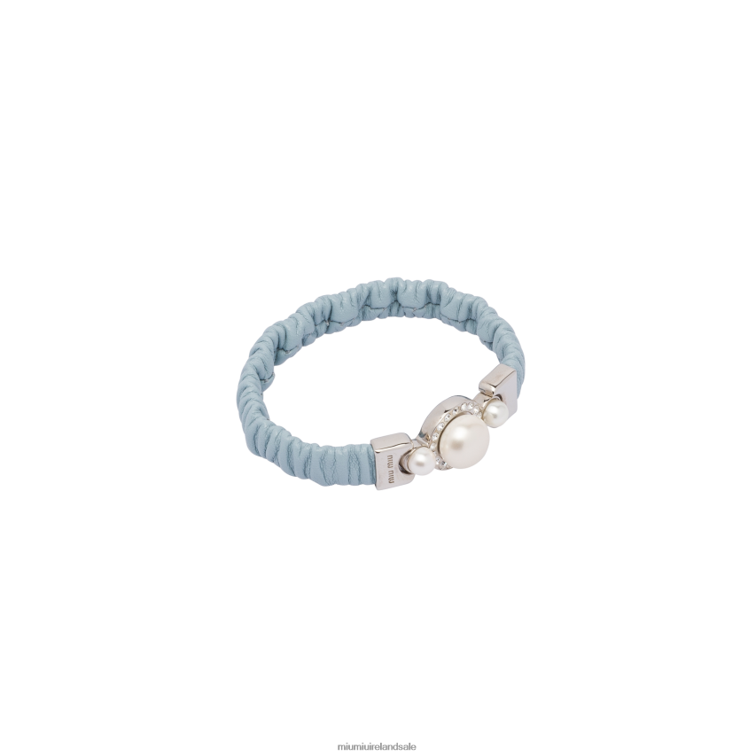 A novel stylistic contrast defines this bracelet with romantic, modern allure, characterized by precious set pearls and crystals that give it a sophisticated look. The nappa leather and metal accessory is decorated with the lasered logo.