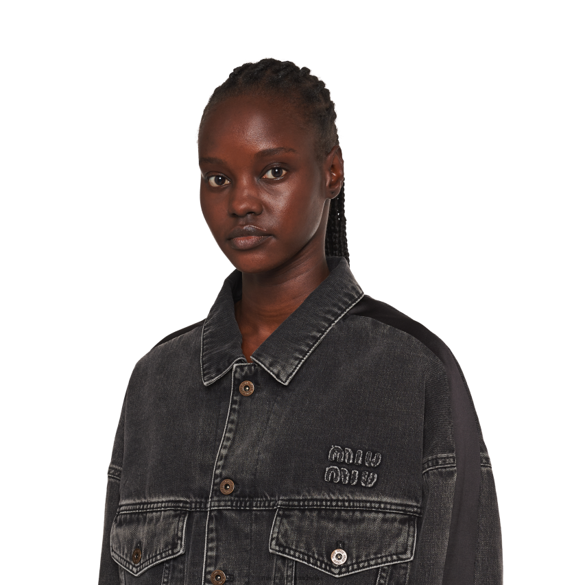 This jacket reinvents classic denim with a hybrid look that combines feminine styles with streetwear-inspired lines.