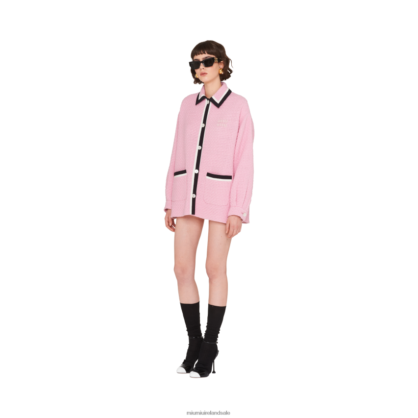 Carefree freshness. Reimagining a classic design, Miu Miu embellishes the tweed blouson jacket with sophisticated details like the embroidered logo. The oversized silhouette adds a note of character to the style with sportswear references.