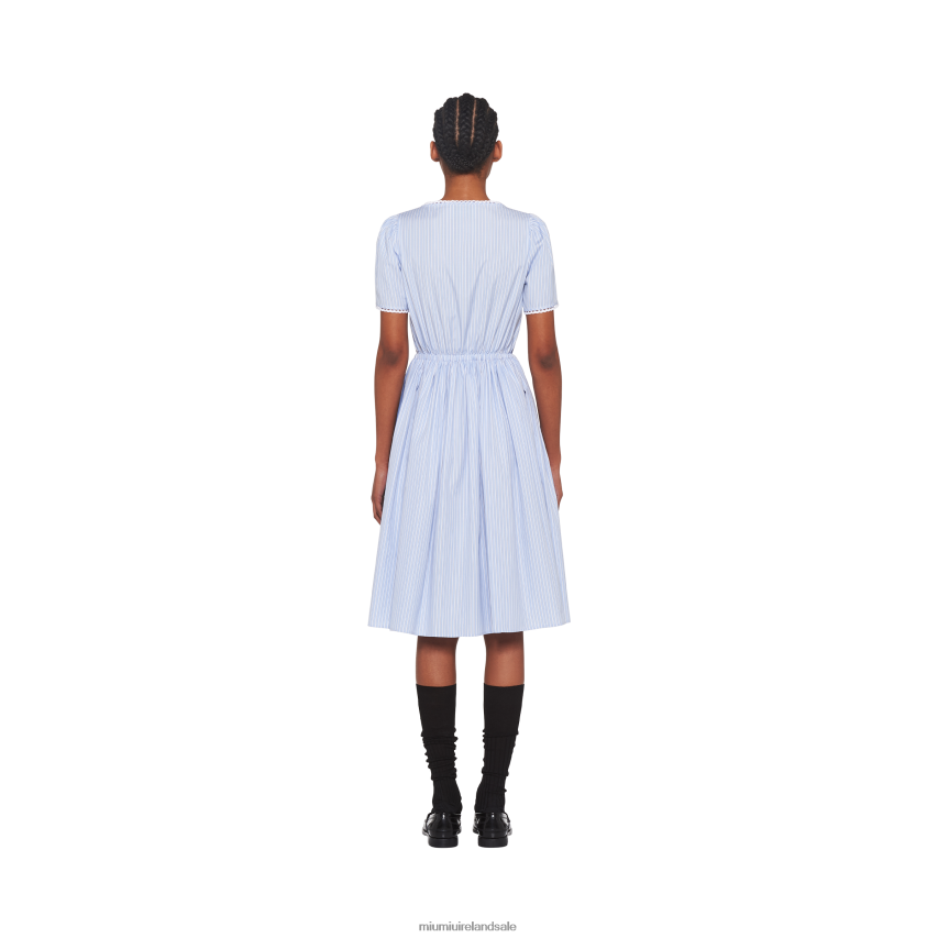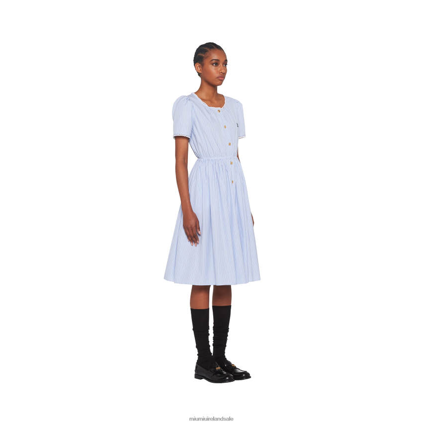 This garment has a retro style blending irony and romanticism. The Miu Miu logo is embroidered in a contrasting color on this fit-and-flare dress with scalloped trim on the neckline and sleeve hem.