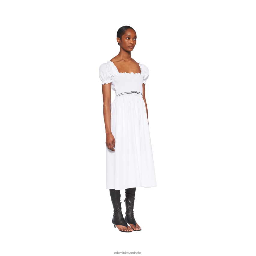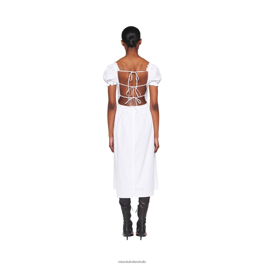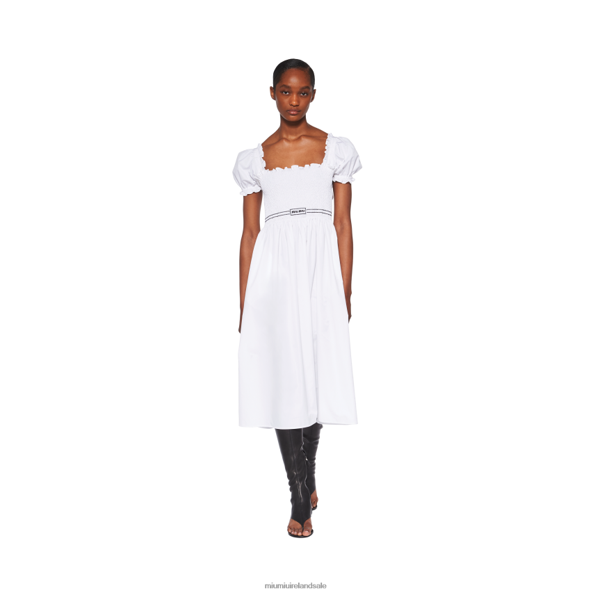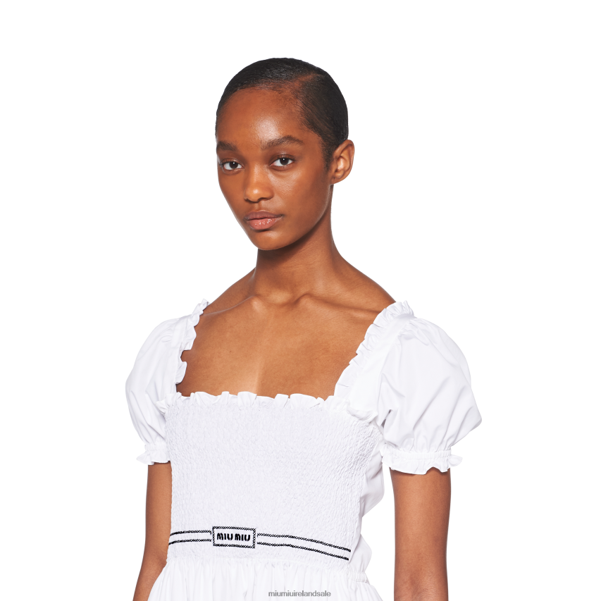In this dress, prairie inspirations, classic charm, and an irreverent attitude outline Miu Miu's strong, distinctive femininity. The smocking embroidery on the bodice and gathering introduce a refined contrast with the skirt and give the garment a romantic character. At the same time, the back with tied laces that bare the skin gives the garment a sensuous personality. The embroidered logo decorates this distinctive style.
