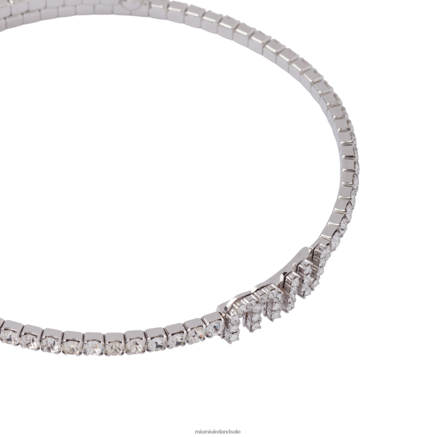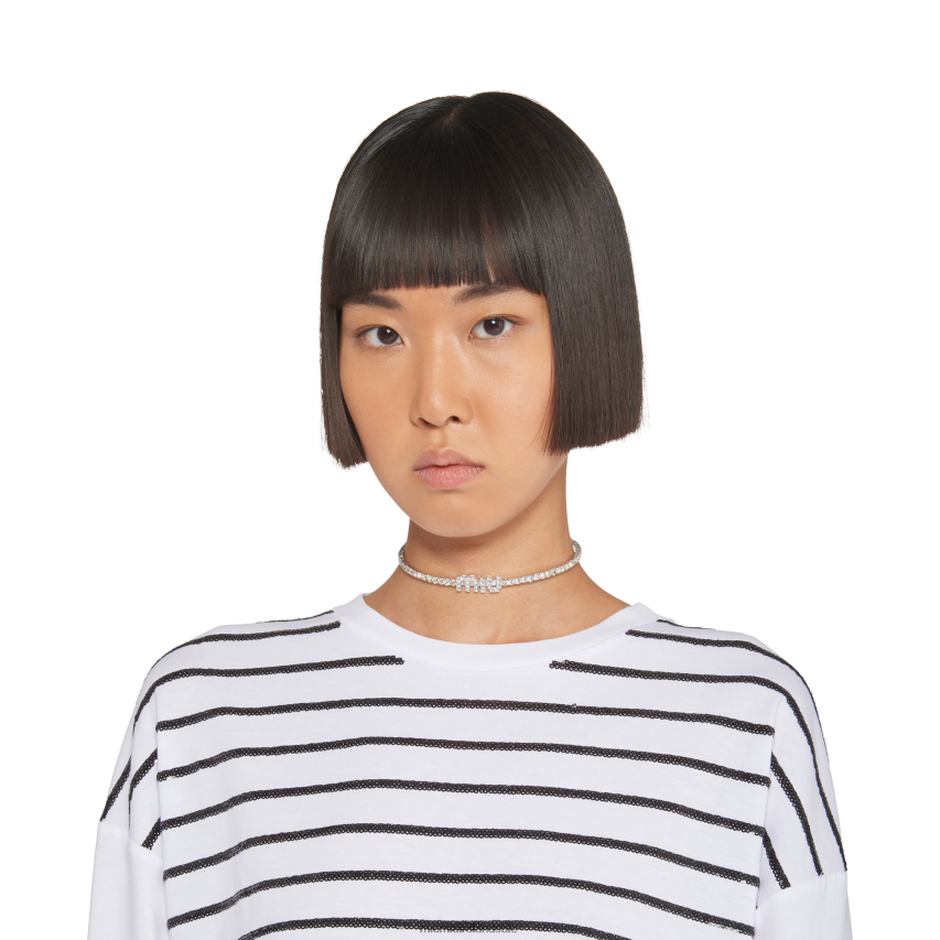 The Miu Miu logo is the protagonist of this necklace. Sparkling crystals embellish this piece, creating a feminine contrast with the modern steel finish of the metal.