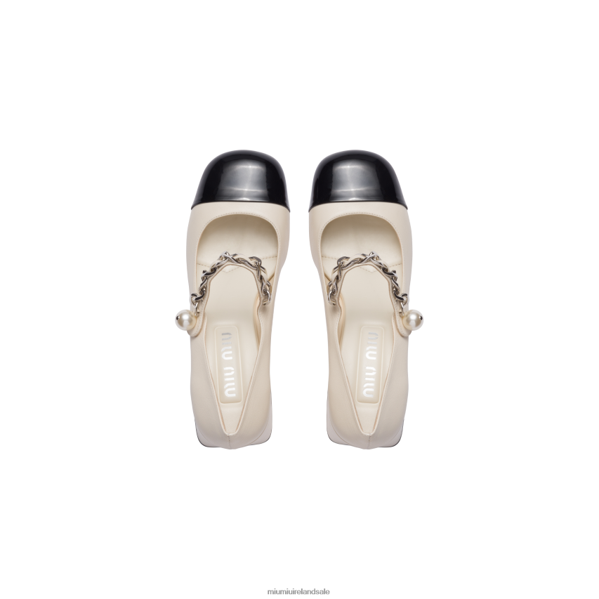Playing with the iconic two-tone design and classic taste, Miu Miu presents a new version of the pump with a sophisticated yet provocative character. The captivating metal chain is combined with the pearl, which evokes traditional style, and the structured heel that recalls a retro world. Thanks to its design, the shoe enters the woman's feminine wardrobe, subverting conventional rules of style.