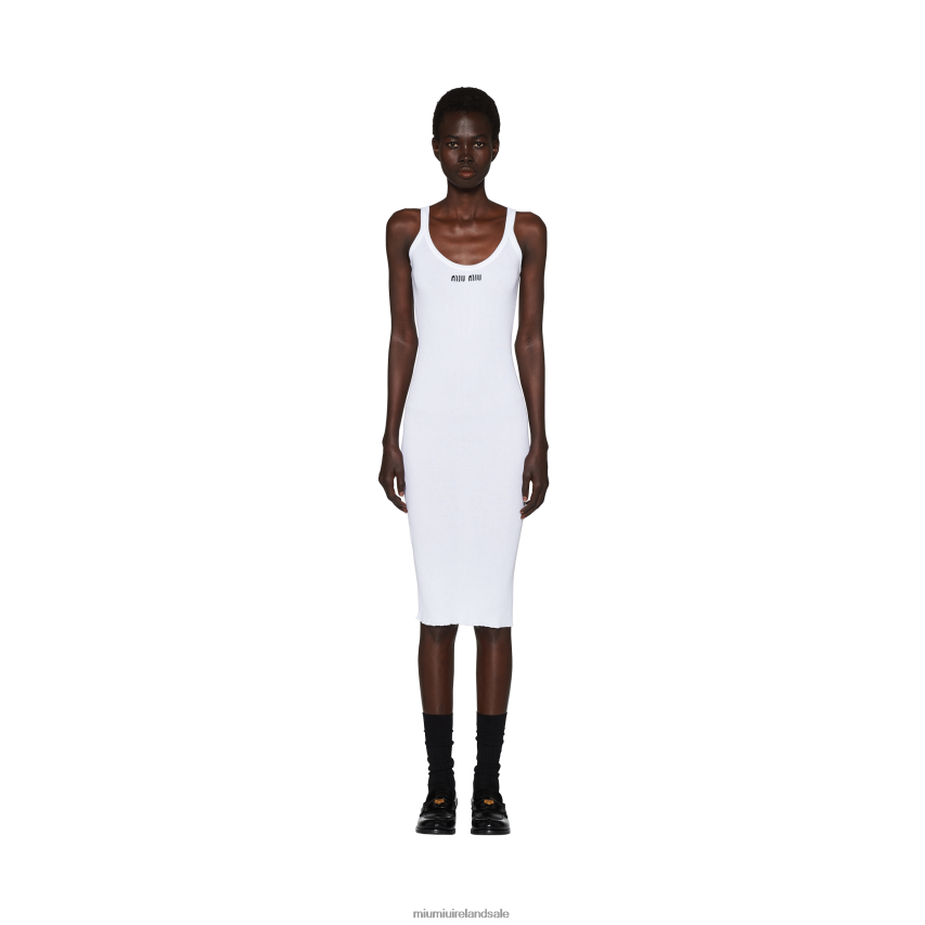 Miu Miu's bold, iconic style accompanies everyday looks and enhances the simple lines of the new cotton dress. The sheath silhouette takes a sporty turn thanks to the ribbed knit that covers the garment, while the intarsia logo in a contrasting color adds a distinctive touch.