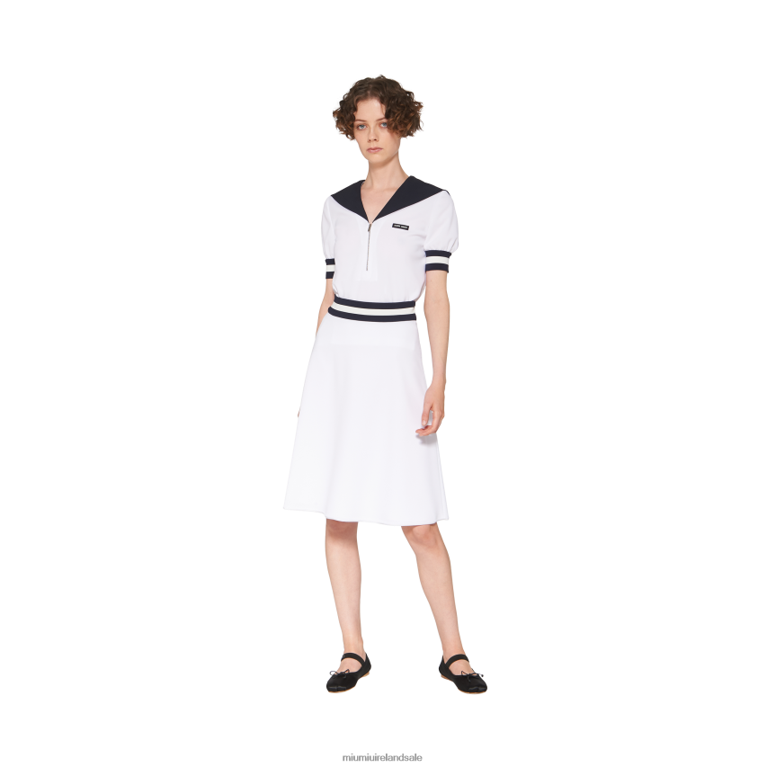 A sailor style embraces Miu Miu's irreverent and whimsical femininity in this new pique top. The collar echoes one of the shades of the two-tone sleeve trim, while the zipper closure adds a dynamic and contemporary touch. The jacquard logo on the chest completes the top with an iconic touch.