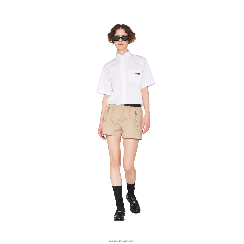 This new poplin shirt reveals the rigor of tradition and formality captivated by Miu Miu's innovative taste and provocative attitude. The straight, classic lines are combined with the raw-cut hem and the logo that decorates the breast pocket with an iconic note.
