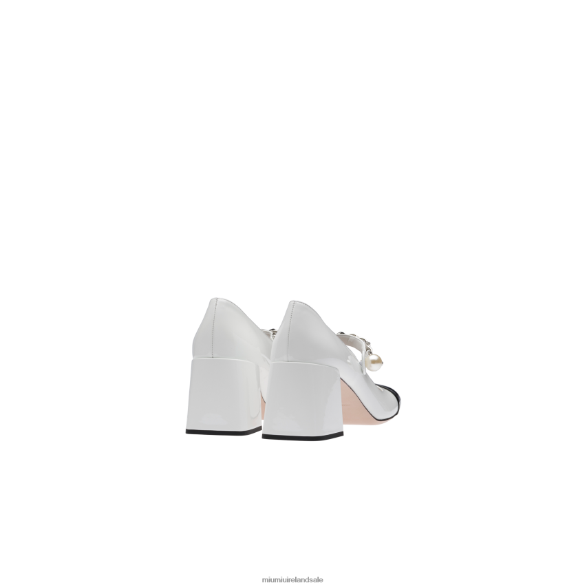 A romantic design and refined details define these patent leather pumps. The instep strap with metal chain and pearl on the closure accent the shoe, recalling the jewelry world. The color contrast between the toe and upper stands out.