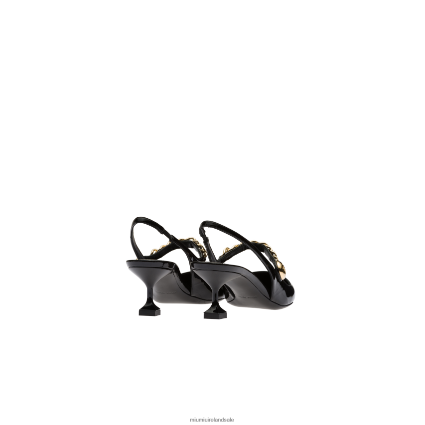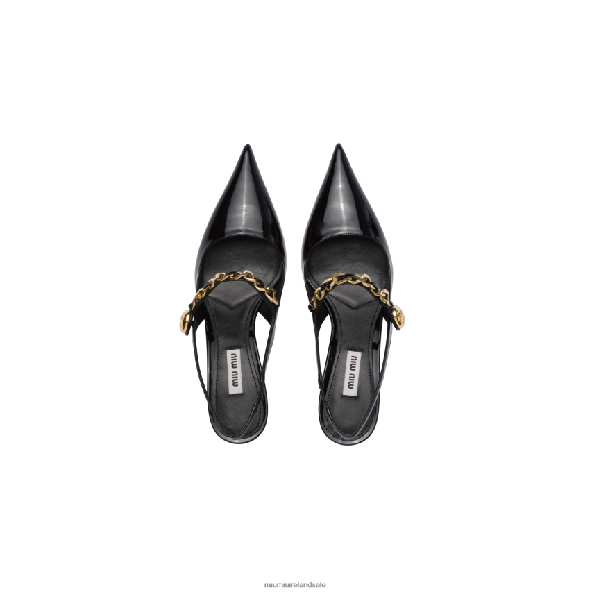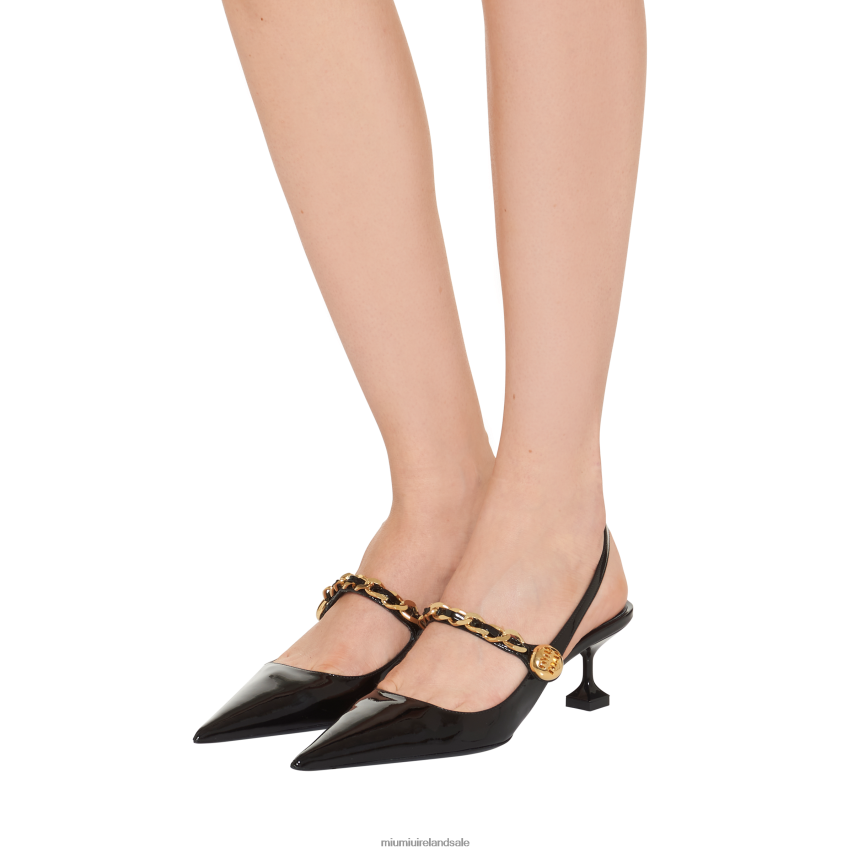 These tapered, sinuous patent leather slingback pumps are accented with the iconic Miu Miu chain on the instep that recalls the jewelry world. The button closure with the metal lettering logo adds an iconic touch.