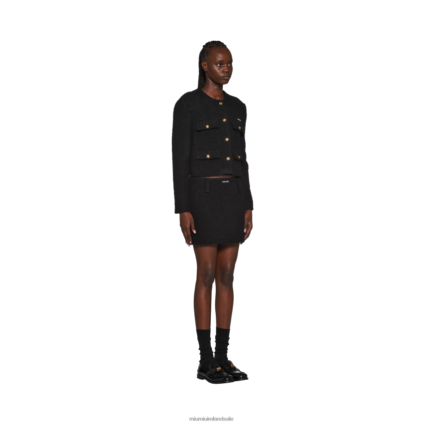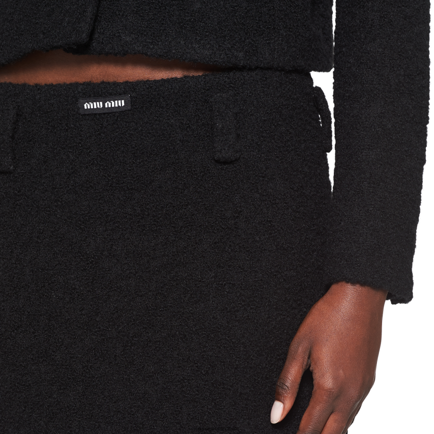 Sleek, modern lines characterize this new boucle skirt. The curly texture of boucle is combined with the contrasting knit logo that adds a distinctive note.