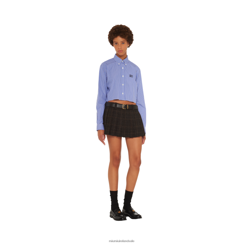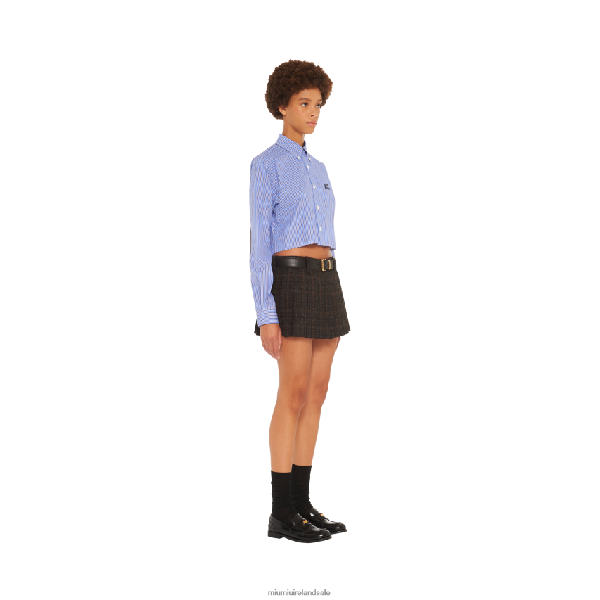Retro fashion and British elegance are referenced with a blend of irony and romanticism. The Miu Miu logo is embroidered on this plaid miniskirt.