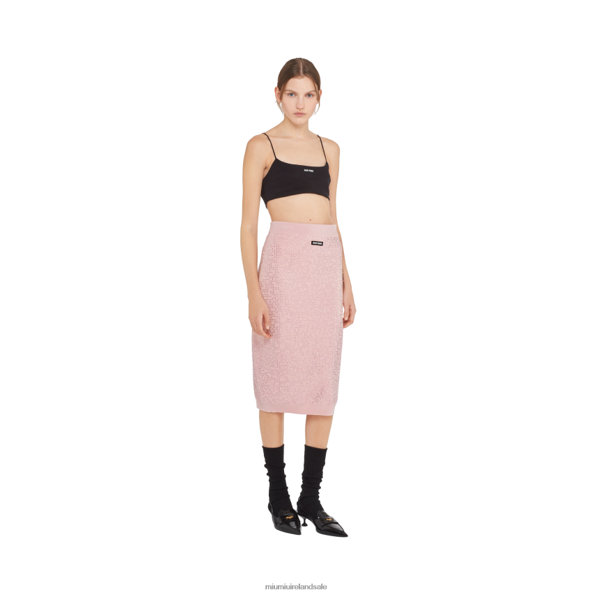 Modern tailoring and accents inspired by the language of evening wear: this wool skirt is characterized by a fitted silhouette and the Miu Miu logo on the front.