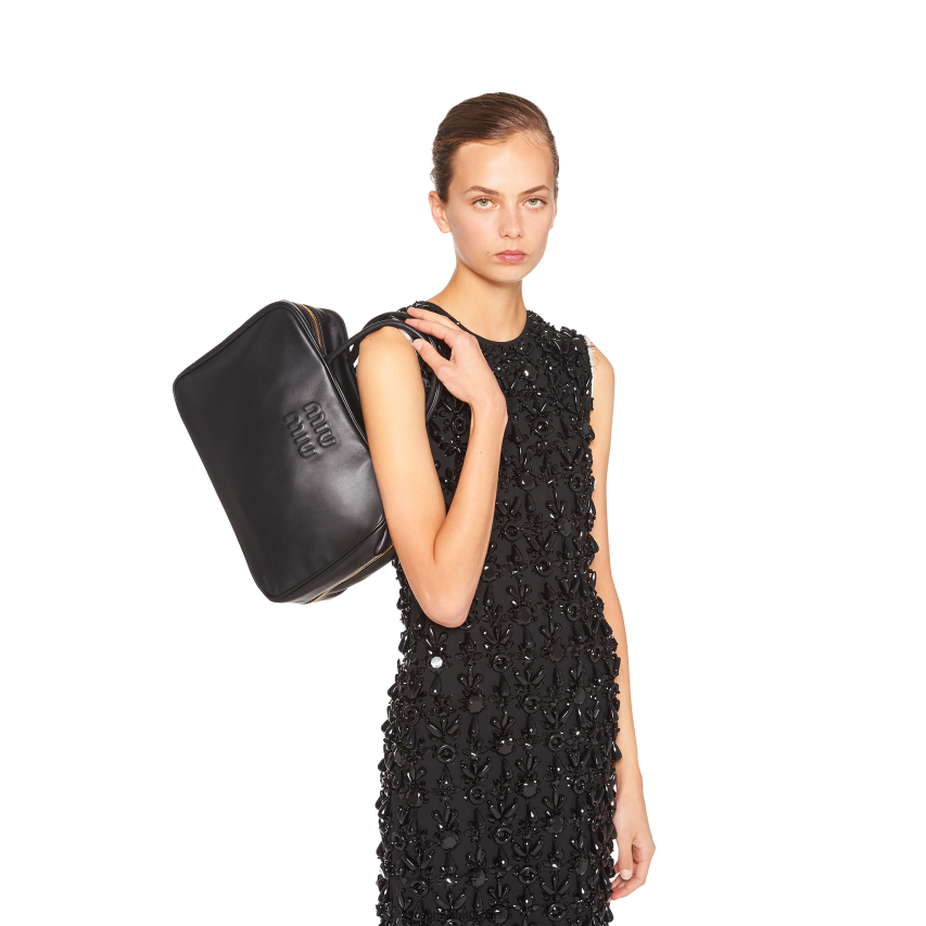 Miu Miu reimagines the iconic bowling bag in a sophisticated and versatile design, for use day and night. Playing with elements of men's and women's wardrobes, this soft leather bag reveals refined artisan craftsmanship. The embossed logo stands out on the front of the bag.